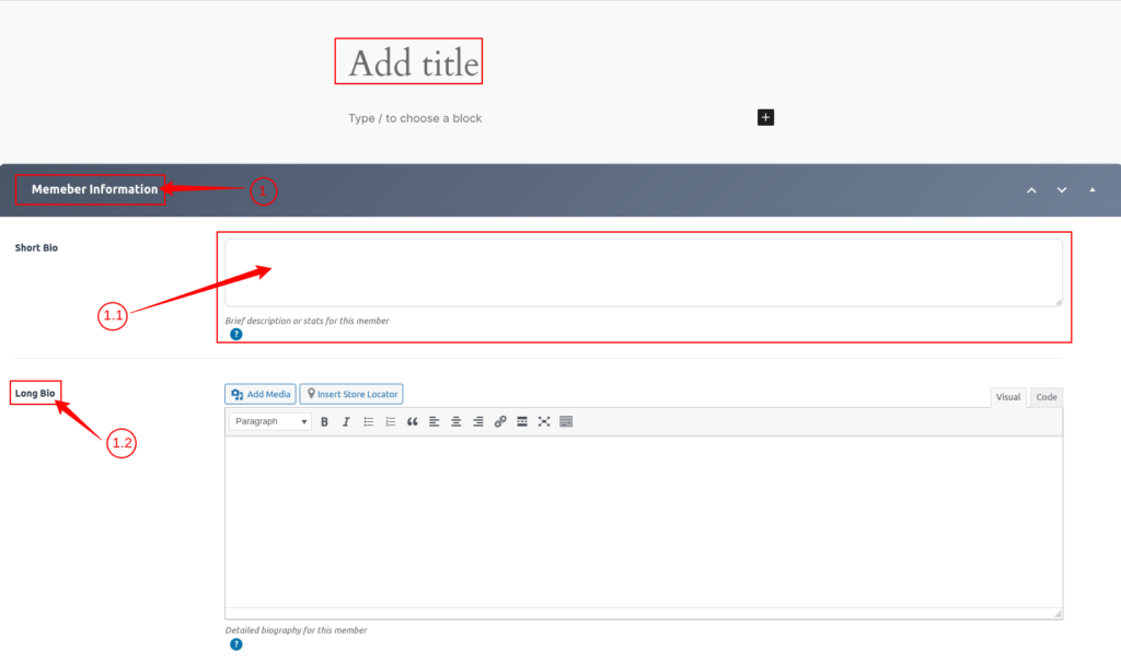 1.2) Long Bio: Add the Long bio of the member it will show on a Single page.