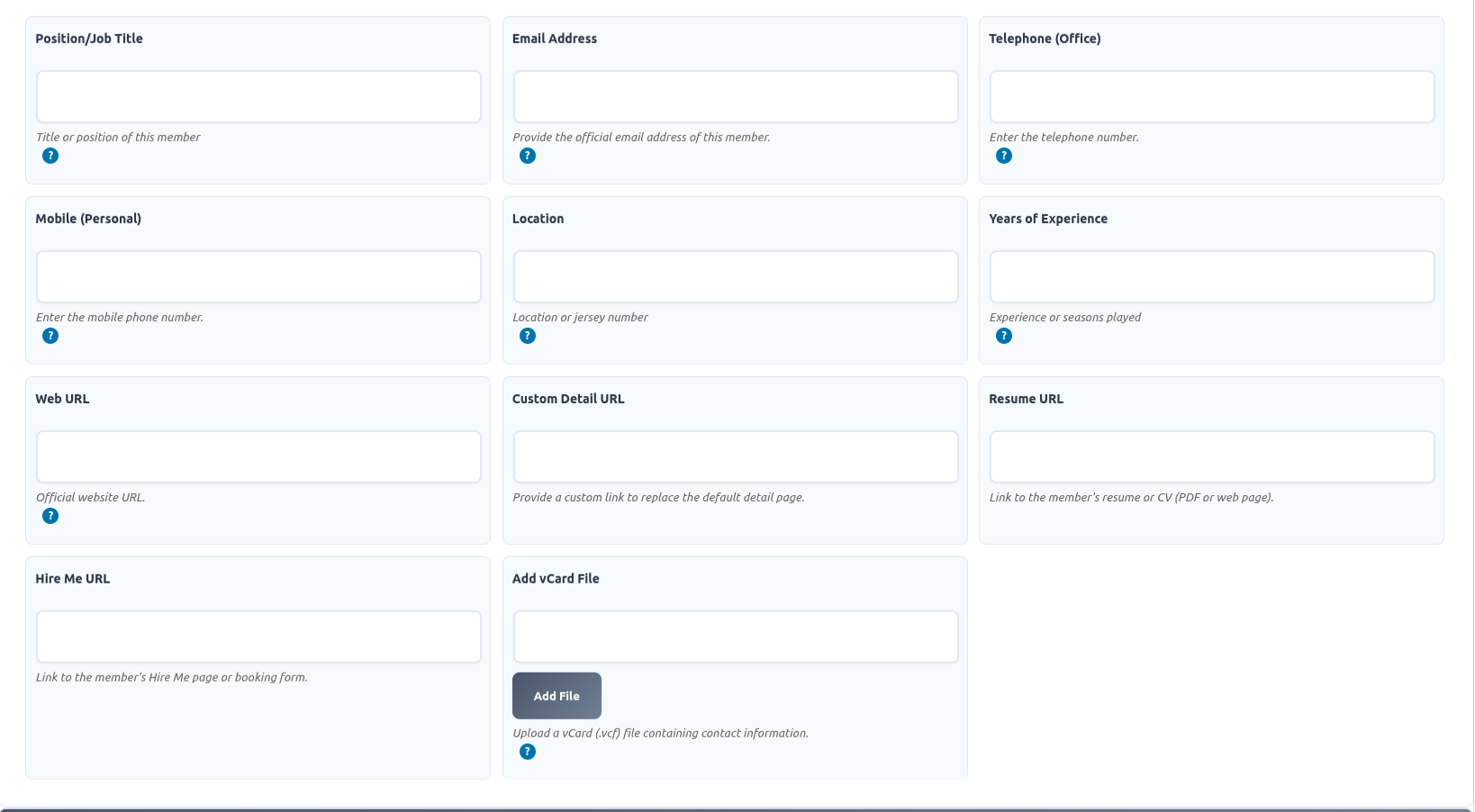 Use the “Add File” button to upload a vCard (.vcf) file containing the member’s contact information for easy downloading by others.