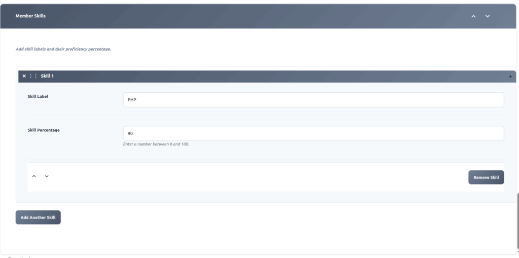 Skill : Add multiple skill tags with progress bars or rating indicators..