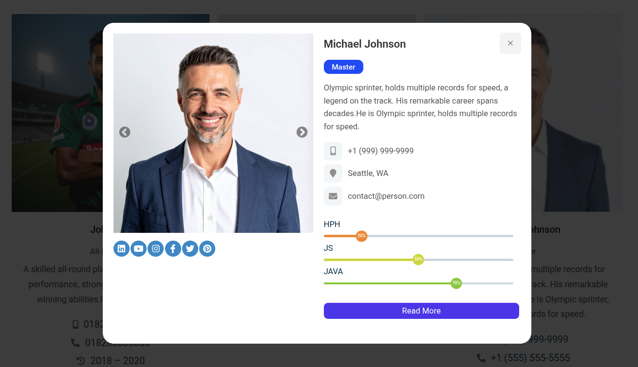 The Popup feature in the WP Team Manager plugin allows you to showcase detailed team member information in a modern, interactive popup window. Instead of navigating to a separate profile page, visitors can instantly view the information without leaving the current page. This makes browsing faster, smoother, and more engaging.