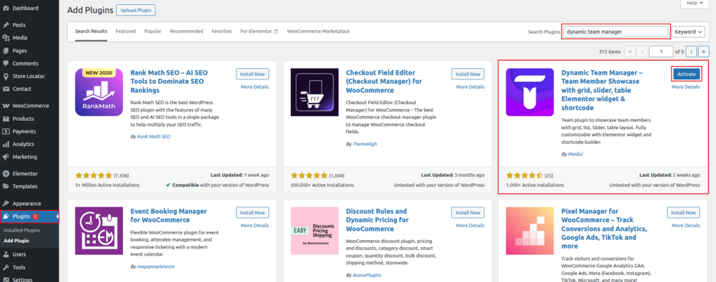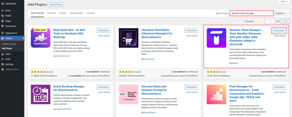 - Install Plugin: Find “Team Manager – WordPress Showcase Team Members” and click “Install Now.“