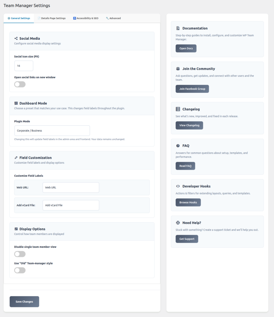 The right sidebar acts as a portal for support and documentation to help you manage the plugin efficiently.