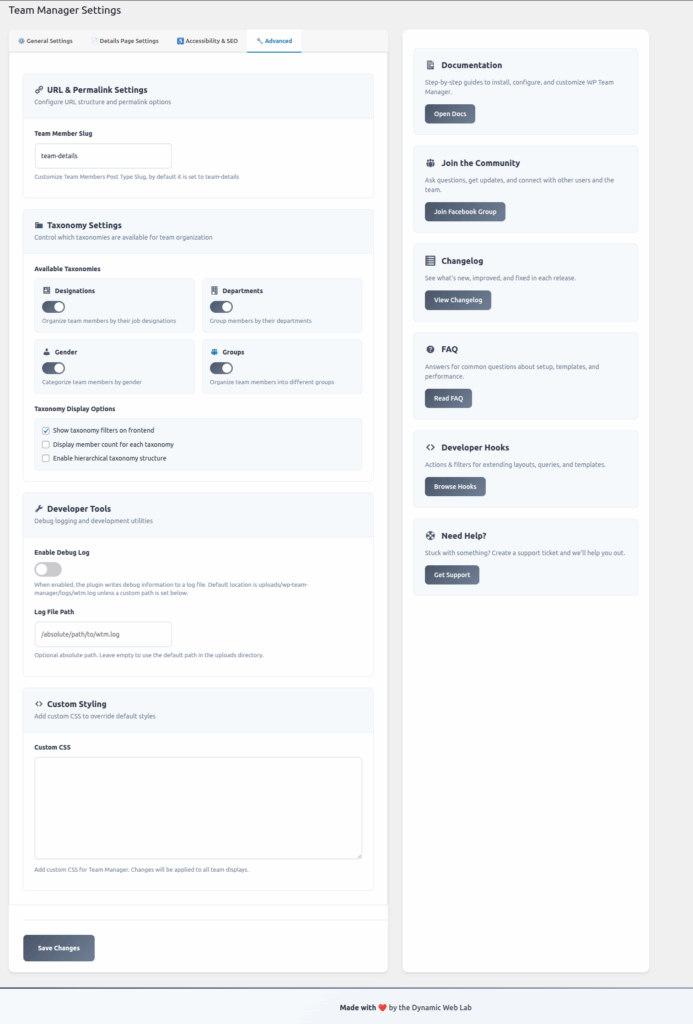 The Advanced tab under Team → Settings contains powerful configuration options related to URL structure, team taxonomy management, debugging, and global custom styling.