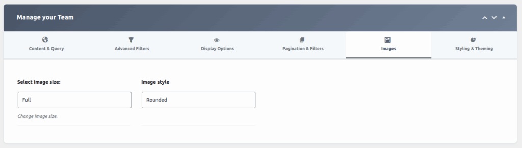 | Image Size | Choose image size (Full, Thumbnail, Custom) |