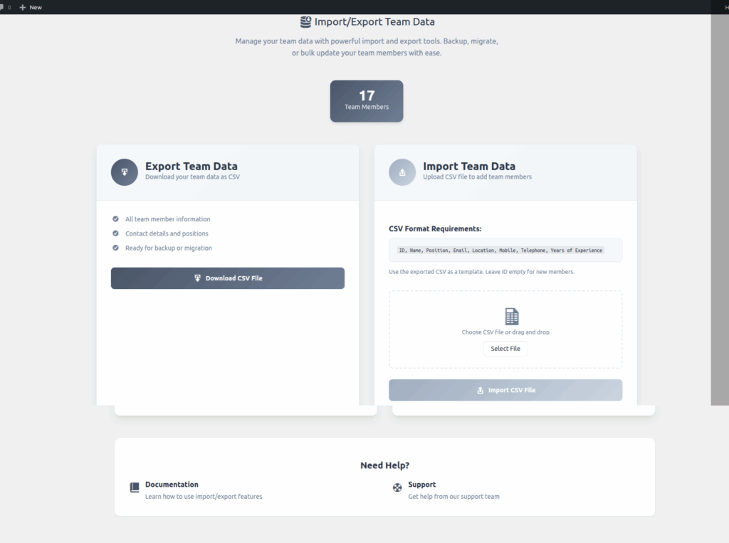 The Import/Export Team Data feature in WP Team Manager allows you to backup, migrate, or bulk manage your team member data with just a few clicks.