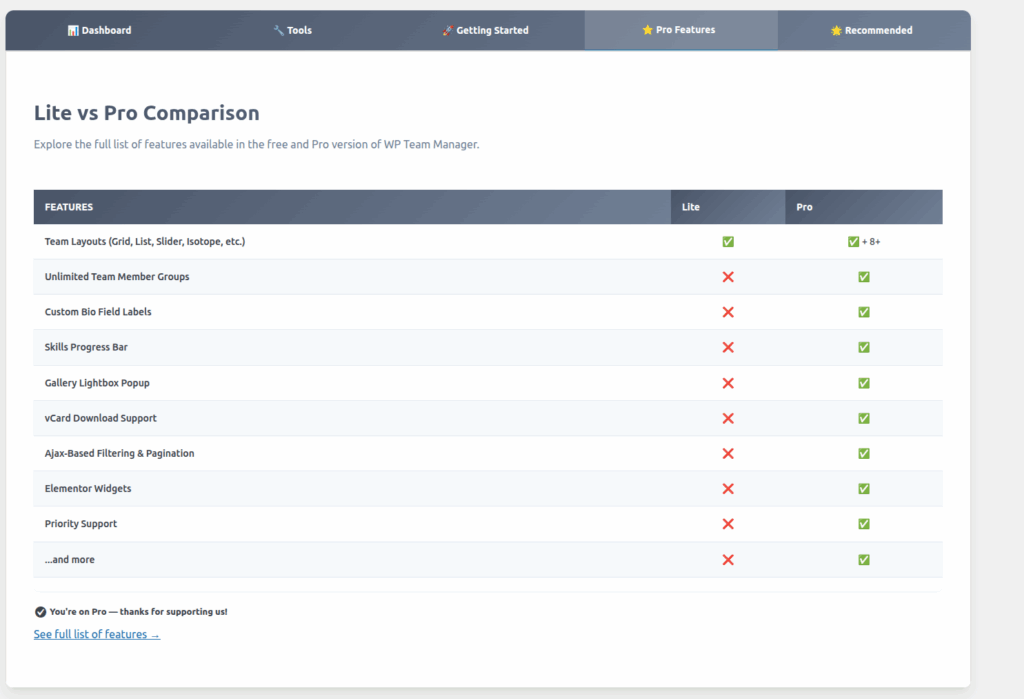 The Lite vs Pro Comparison section helps users understand the differences between the free (Lite) and premium (Pro) versions of WP Team Manager.